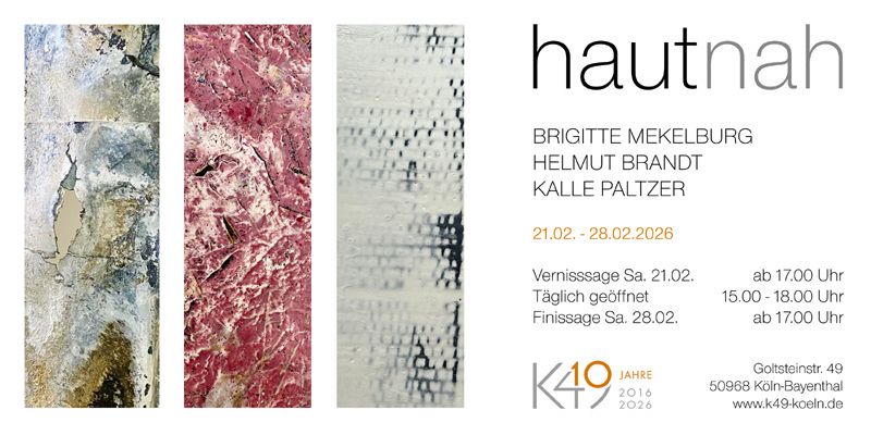 HAUT und NÄHE lassen unmittelbar an Berührung denken. Der Titel „hautnah“ beschreibt diese besondere Nähe, die einer Berührung vorausgeht. Genau darum geht es in den Bildern, Objekten und Skulpturen des Künstlertrios Brigitte Mekelburg, Helmut Brandt und Kalle Paltzer. Während Brandt hauchdünne Acryl-Farbhäute von Glasplatten löst und sie als glatte, gebrochene, rissige oder fragmentierte Schichten auf Leinwände überträgt, suggerieren Paltzers Papierschichten Verletzungen, Äderchen, Gerippe und Zerbrechlichkeit. Mekelburg verwendet Gips, Wachs und Kaseinfarbe für ihre eigentümlichen Kreationen, die sich zwischen Organischem und Gestaltetem bewegen. Was alle Arbeiten miteinander verbindet ist, dass sie die Betrachtenden reizen, die Oberflächen zu berühren, statt nur „mit dem Auge zu fühlen“.
