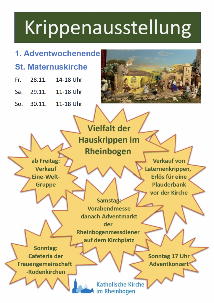 Am 1. Adventwochenende werden in der Kirche St. Maternus Hauskrippen von Familien im Rheinbogen gezeigt. Ergänzend findet wieder samstags ein gemütlicher Adventmarkt der Messdiener und sonntags eine Cafeteria der Frauengemeinschaft statt. Außerdem gibt es einen Verkauf von Laternenkrippen und einen Stand der Eine- Welt-Gruppe. Die Ausstellung endet mit einem Konzert des Konvergenz Quartetts.