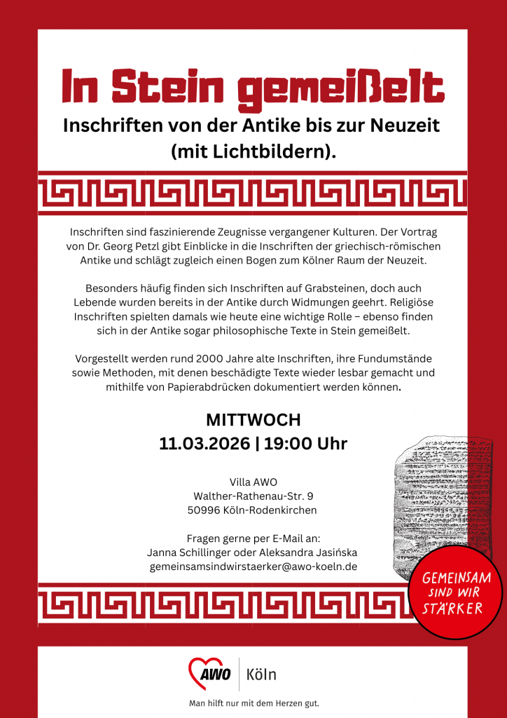Inschriften von der Antike bis zur Neuzeit: Inhalt, Fundumstände, Technisches. Mit Lichtbildern. Vortrag (45 Min.) mit anschließender Diskussion. Foto: AWODieser Eintrag wird Ihnen zur Verfügung gestellt vom Kölner BilderBogen - […]