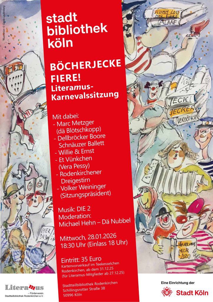 Stadtteil-Bibliothek Rodenkirchen Schillingsrotter Str. 38, Köln, NRW, DeutschlandLiteramus-Karnevalssitzung mit Spitzenkräften des Kölner Karnevals, u.a. Marc Metzger und Volker Weininger, und dem „Nubbel“ (Michael Hehn) als Moderator. VVK Teekesselchen ab Mittwoch 31.12.25 Mitglieder Literamus ab Sa.28.12.2025Dieser Eintrag wird […]