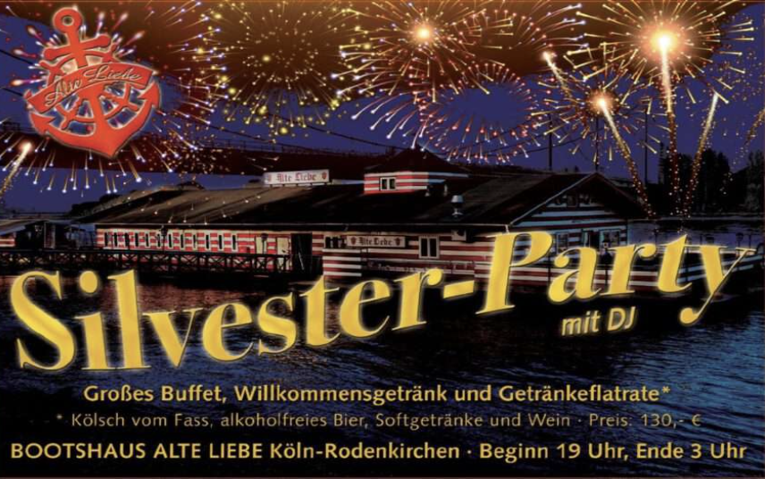 BOCK AUF PARTY ? Wir werden in diesem Jahr wieder mit einzigartiger Atmosphäre das alte Jahr den Rhein runterfließen lassen. Die Karten sind vor Ort erhältlich.Dieser Eintrag wird Ihnen zur Verfügung gestellt vom Kölner BilderBogen - eines der beliebtesten Stadtmagazine in Köln. Ihr Termin fehlt? Einfach kostenlos einreichen: www.bilderbogen.de/eventeintrag