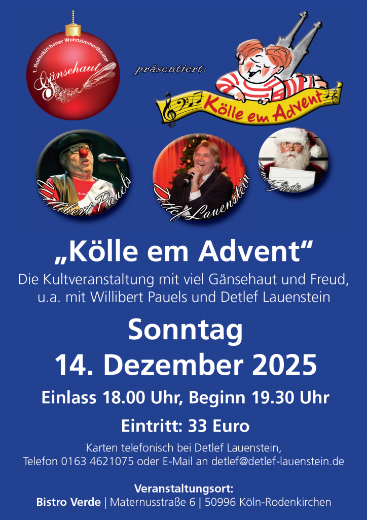 Die Kultveranstaltung mit viel Gänsehaut und Freud, u.a. mit Willibert Pauels und Detlef Lauenstein Einlass 18 Uhr, Beginn 19.30 Uhr Karten telefonisch bei Detlef Lauenstein, Telefon 0163 4621075 oder E-Mail an detlef@detlef-lauenstein.deDieser Eintrag wird Ihnen zur Verfügung gestellt vom Kölner BilderBogen - eines der beliebtesten Stadtmagazine in Köln. Ihr Termin fehlt? Einfach kostenlos einreichen: www.bilderbogen.de/eventeintrag