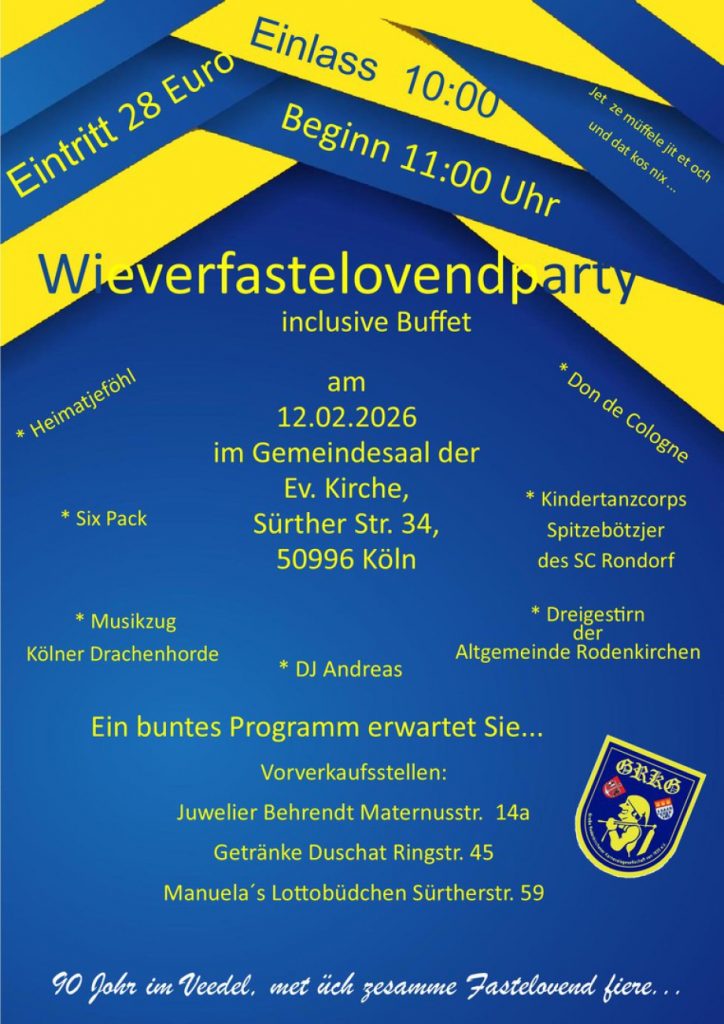 Veranstaltungen der KG Köln-Rodenkirchen von 2014 e. V. : 29. August 2025 KG Köln-Rodenkirchen von 2014 e.V. JECKE RIVIERA Das Sommerfest der KG Köln-Rodenkirchen Rhein Roxy Schiff Karten ab Juni hier: www.kgkr.de 17. Januar 2026 KG Köln-Rodenkirchen von 2014 e.V. JECK IN HELLBLAU Singe, Danze, Höppe in der Hofburg Dorint Hotel Heumarkt Karten ab September […]