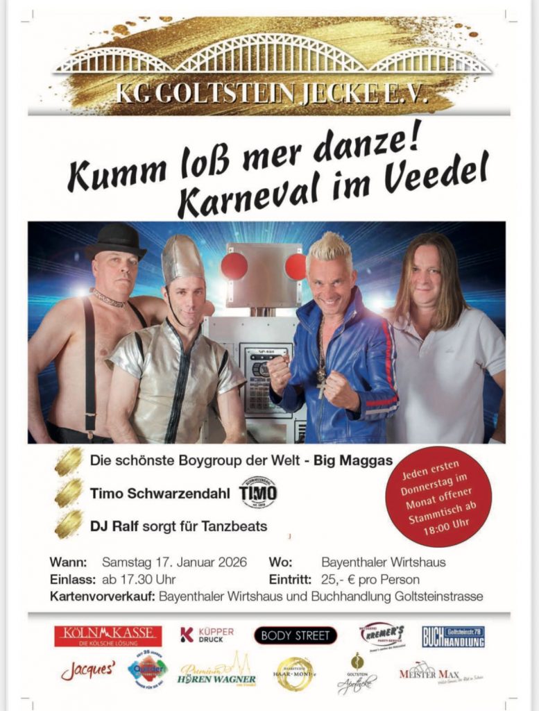 Bayenthaler Wirtshaus Goltsteinstraße 83, Köln, NRW, DeutschlandKarnevalsparty der KG Goltsteinjecke e.V. im Bayenthaler Wirtshaus. Liveauftritt der Big Maggas und Timo Schwarzendahl. Für Tanzbeats sorgt DJ Ralf KG Goltsteinjecke e.V.Dieser Eintrag wird Ihnen zur Verfügung gestellt vom Kölner BilderBogen - eines der beliebtesten Stadtmagazine in Köln. Ihr Termin fehlt? Einfach kostenlos einreichen: www.bilderbogen.de/eventeintrag